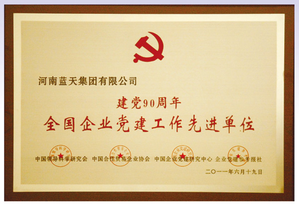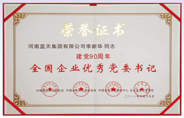 6月19日,在北京钓鱼台国宾馆召开的“建党90周年全国企业党建创新论坛暨全国企业党建工作先进单位和全国企业优秀党委书记表彰大会”上,集团公司荣获建党90周年全国企业党建工作先进单位,集团公司董事长、党委书记李新华荣膺全国企业优秀党委书记称号。这也是我市唯一一家获此殊荣的企业。