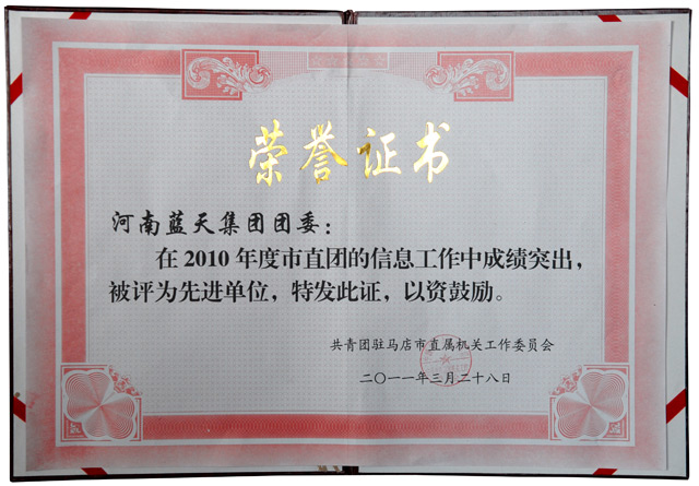 3月28日,集团公司团委2010年信息报送工作受到市直团工委嘉奖,荣获“2010年度信息工作先进单位”。