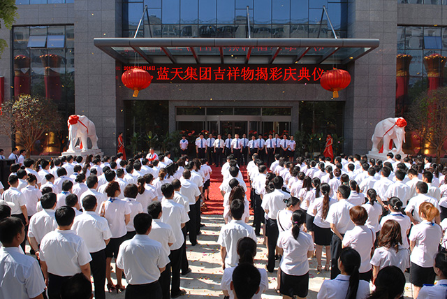 最后,集团公司党委书记、董事长李新华隆重宣布蓝天集团吉祥物揭彩,四位股东代表、党员代表、团员代表、员工代表李国喜、杨帆、张新建、冯备仓共同为吉祥物揭彩。仪式结束后,集团公司领导、各分子公司主要负责人还在吉祥物前合影留念。