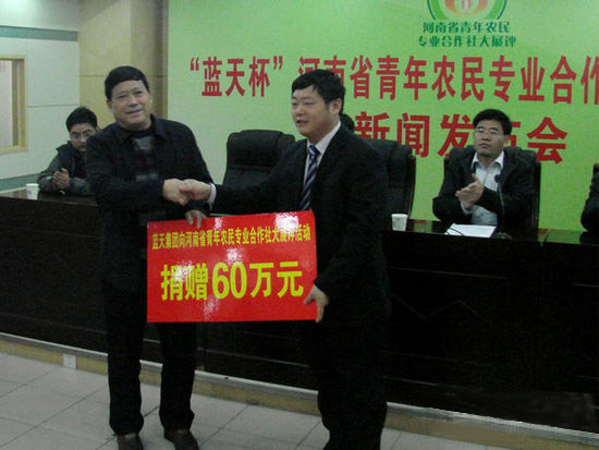 11月22日,团省委联合省委农办等13个单位组织召开新闻发布会,由蓝天集团提拱60万元捐赠,在全省启动“蓝天杯”河南省青年农民专业合作社大展评活动,活动将对评选出的河南省青年农民专业标兵(优秀)合作社给予总计60万元的物质奖励。
