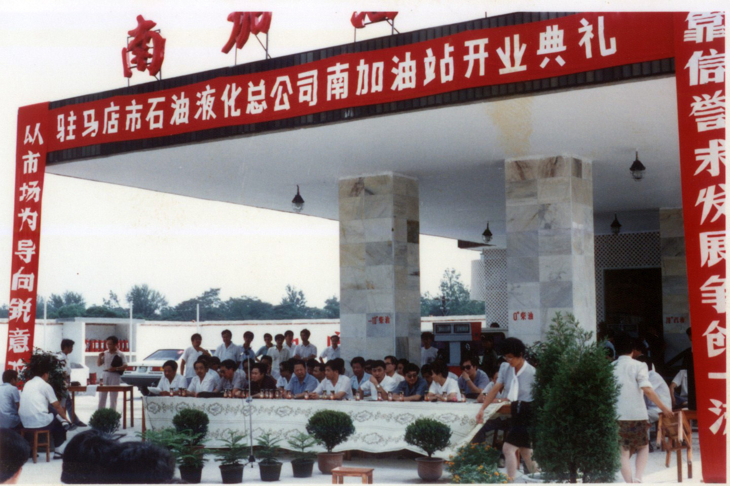 市石油液化气总公司建成南加油站,该站地下储罐40个,占地4.3亩,加油量2200吨,安排工作人员20人。图为加油站开业典礼。