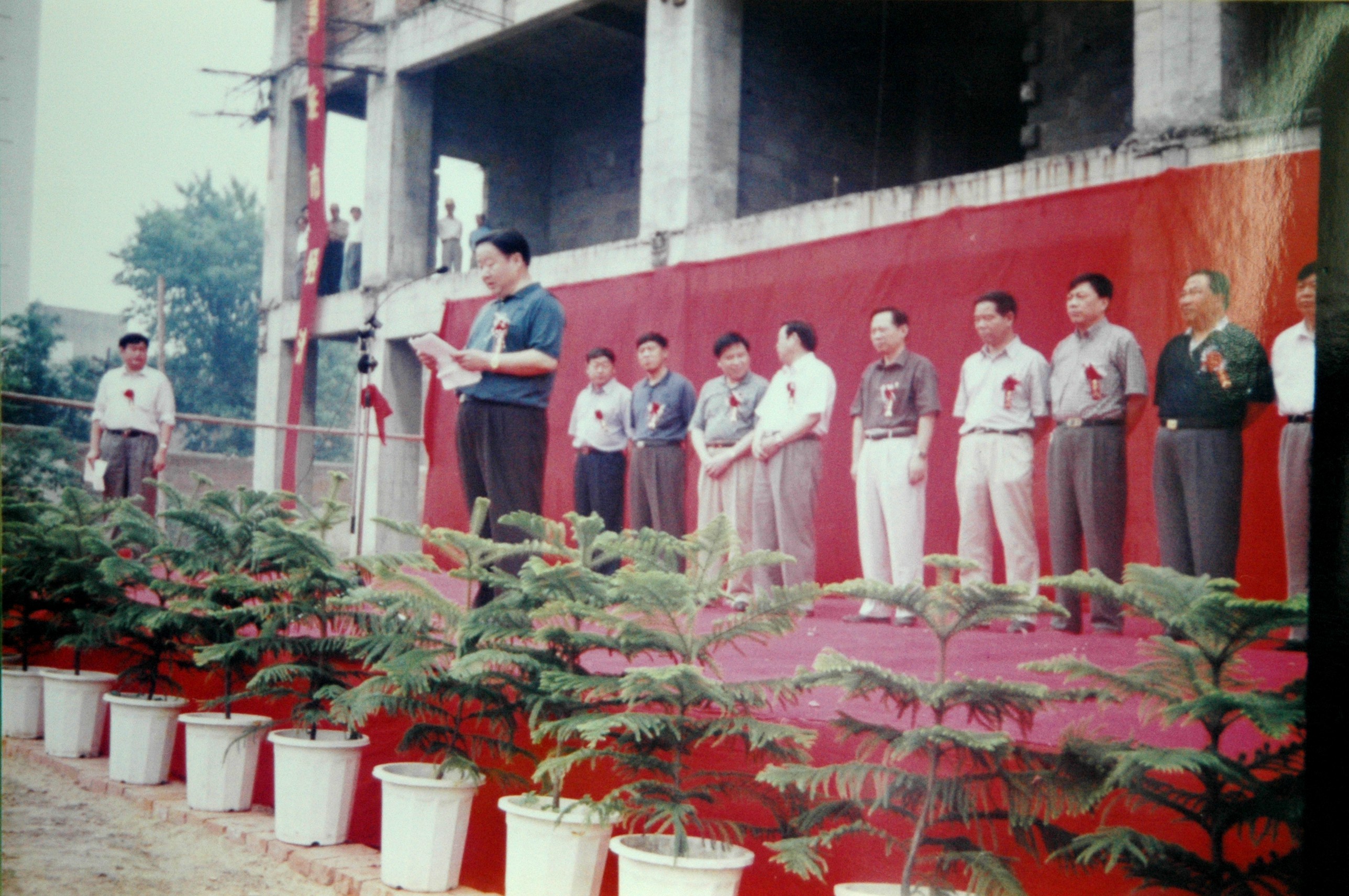 为提升驻马店市城市形象,公司接手华蓉餐厅旁边停工多年的半拉子工程,开工建设中原大厦。图为中原大厦开工仪式。
