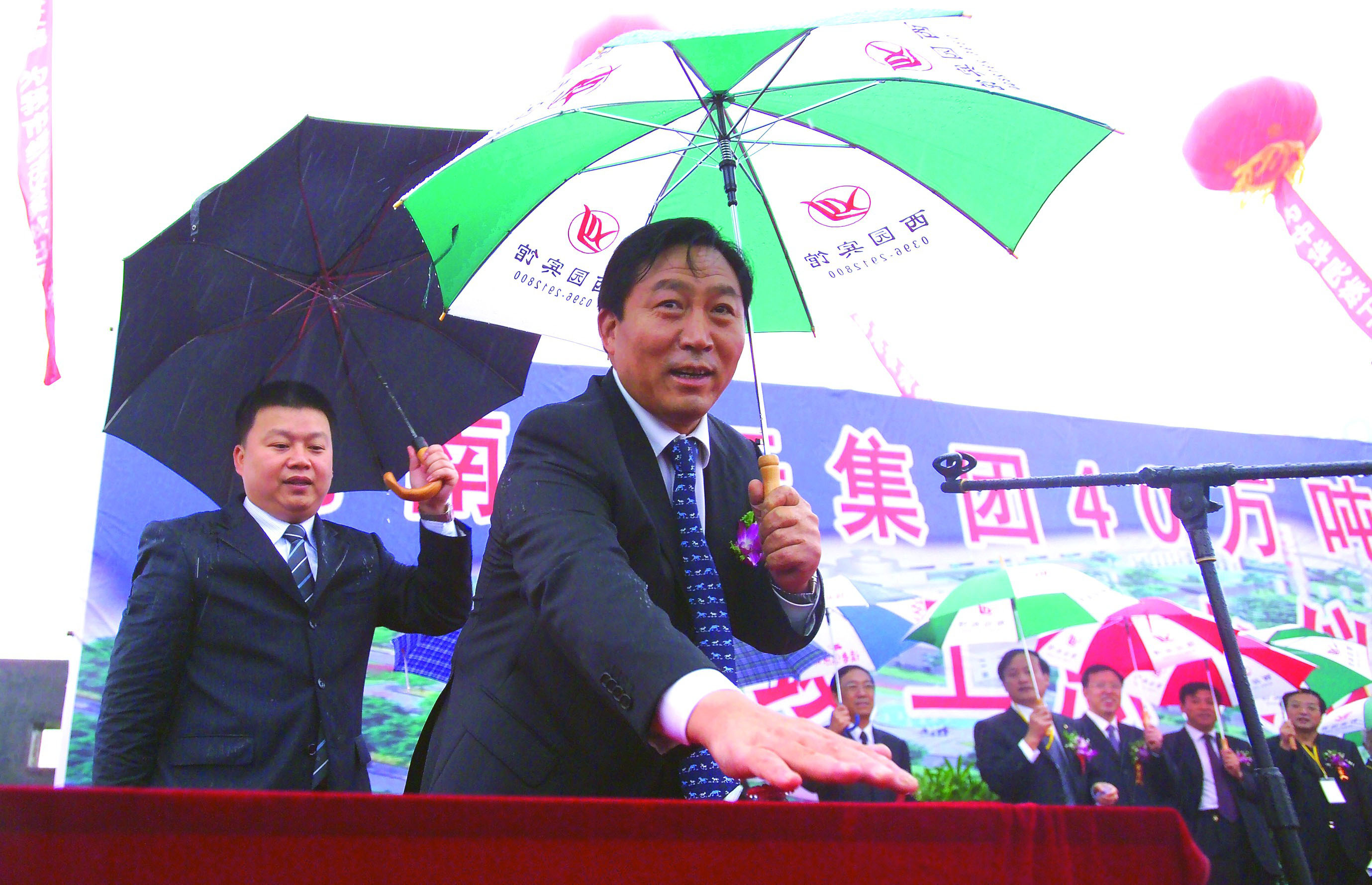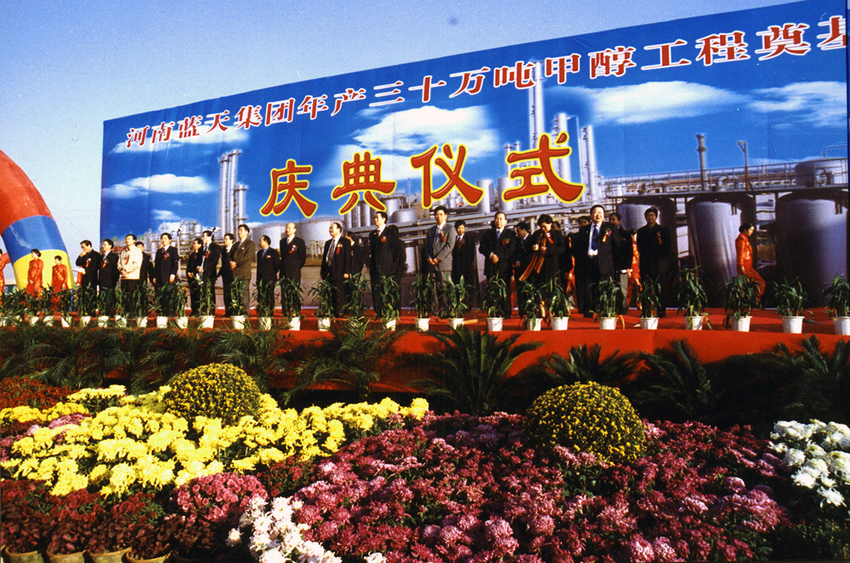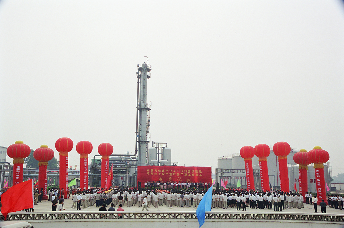 年产40万吨甲醇工程竣工点火仪式在中原甲醇厂隆重举行,该工程是当时建成的国内单套产能最大的装置。图为副省长史济春按下工程竣工点火启动按钮。