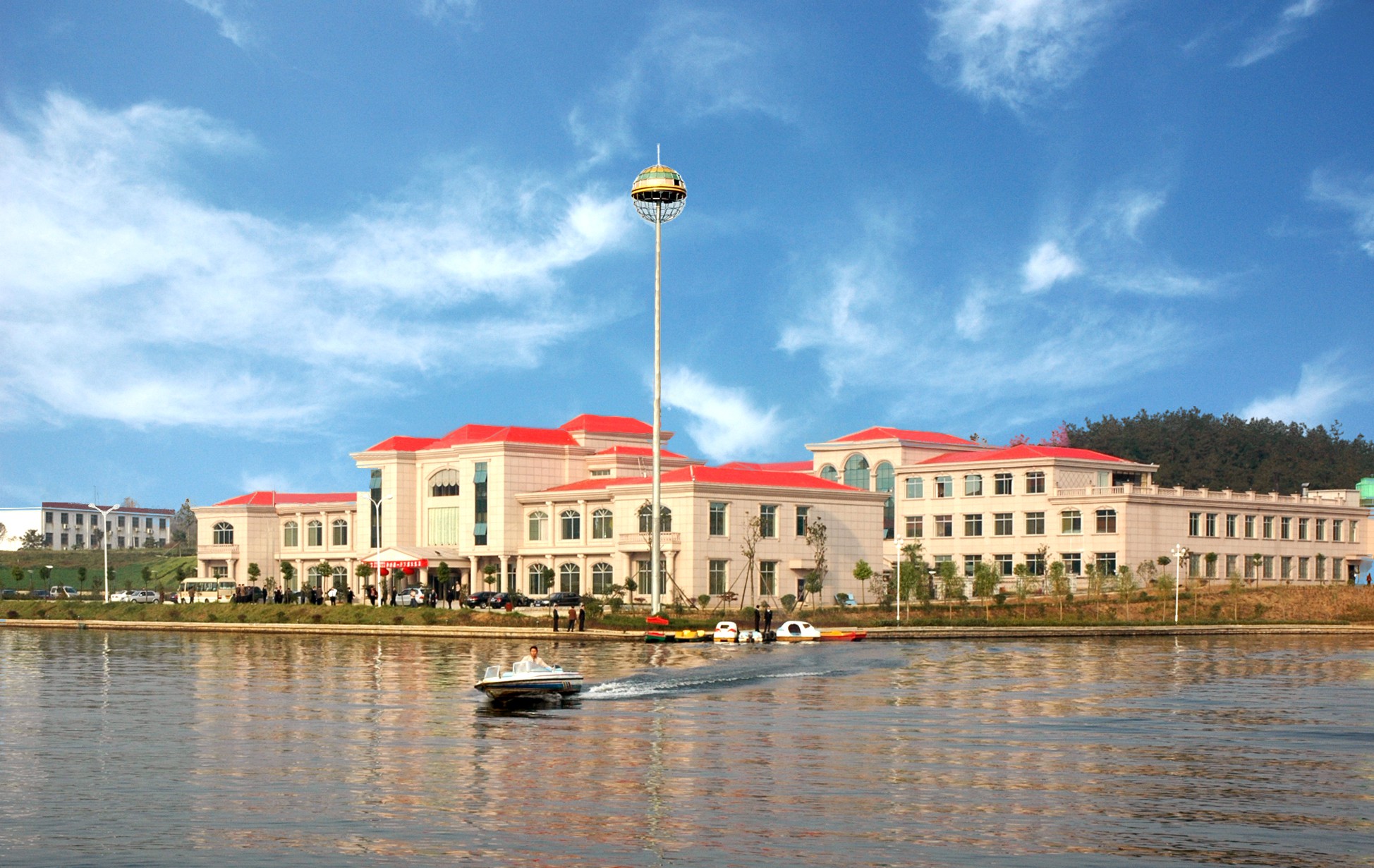 公司在光山县敖洼村投资的集旅游、休闲、度假于一体的蓝天度假村正式建成。图为蓝天度假村外景。