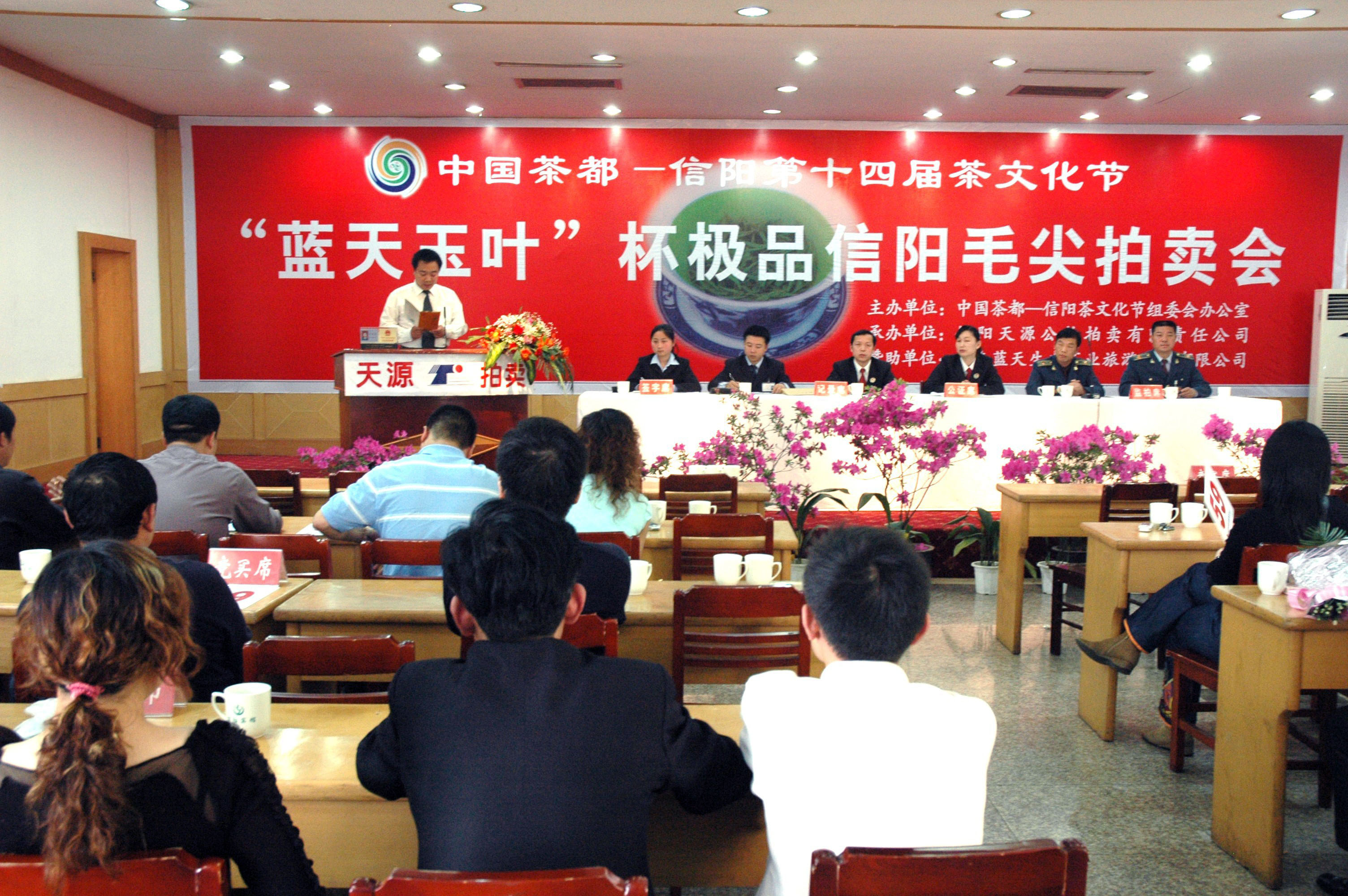 在“第十四届中国茶都”、“信阳茶文化节”上,蓝天玉叶喜获“信阳毛尖”至尊荣誉称号,二两绿茶拍卖售价高达14.9万元。图为拍卖会现场。