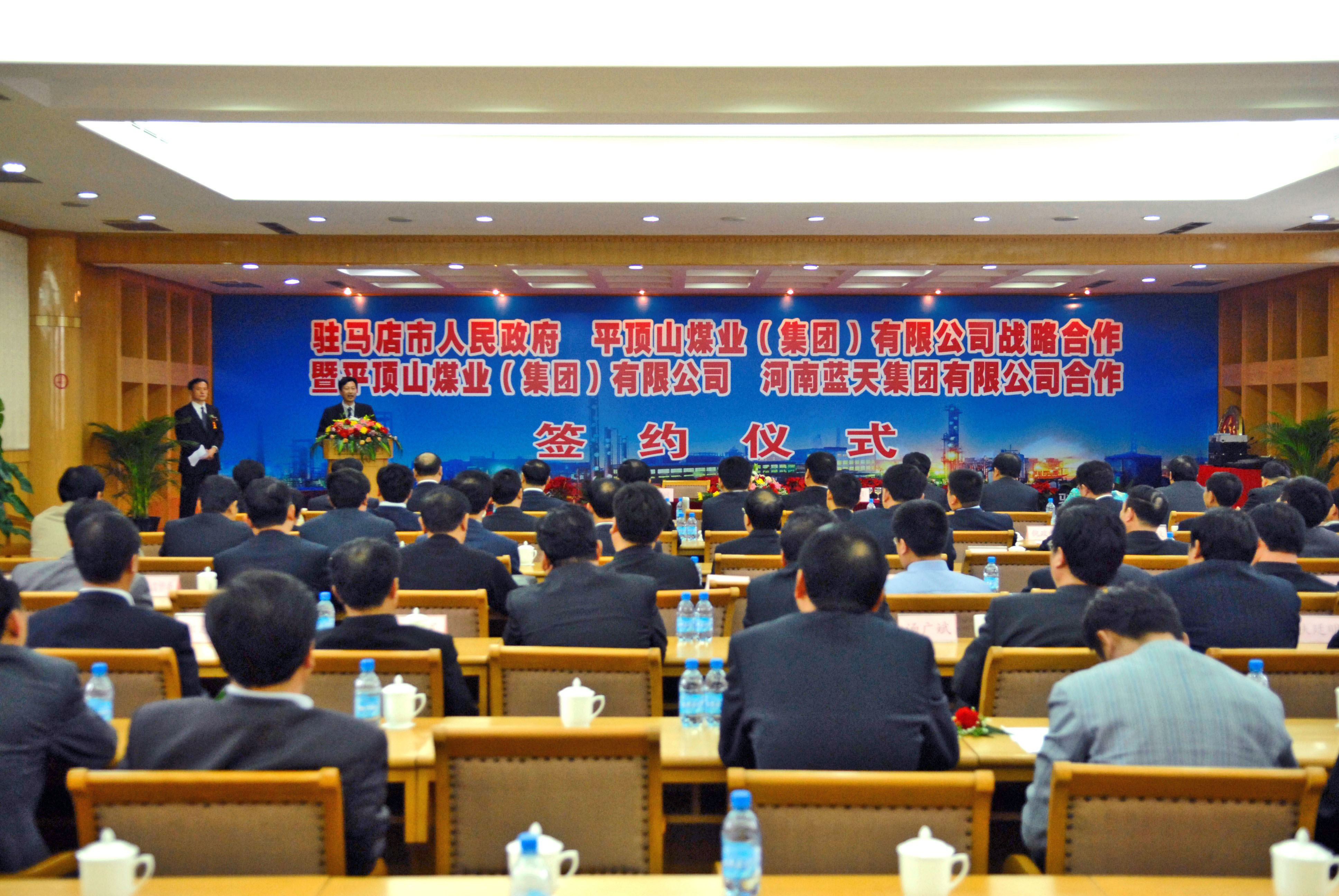 平煤集团与蓝天集团达成战略合作,这是河南省加快建设豫南煤化工产业基地的重大举措。图为在驻马店市西园宾馆举行的签约仪式现场。
