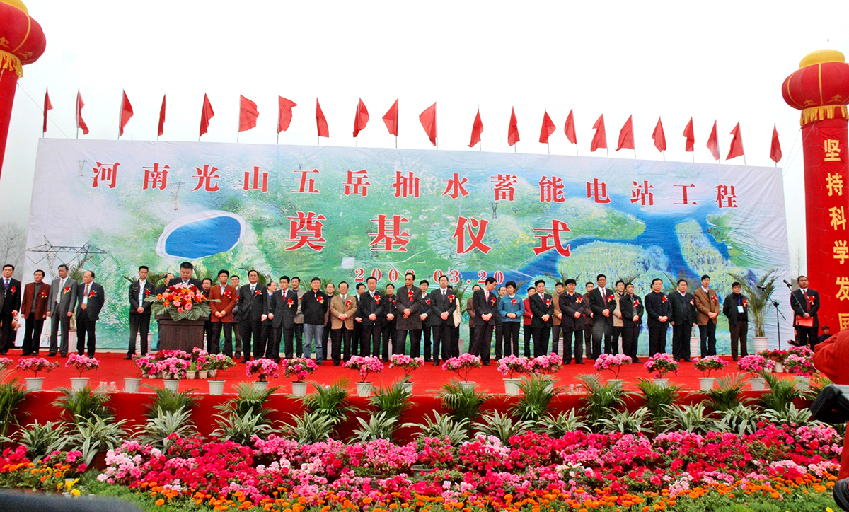 河南光山五岳抽水蓄能电站工程举行奠基仪式,是信阳市水电发展史上、工业发展史上的重要里程碑,可以优化电网电源结构,增强调峰能力。图为奠基仪式现场。