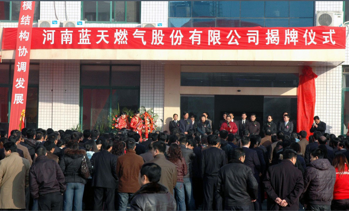 河南蓝天燃气股份有限公司成立,标志着公司朝着建设管理型现代化优秀民营企业奋斗目标迈出的重要一步。图为蓝天燃气举行揭牌仪式现场。