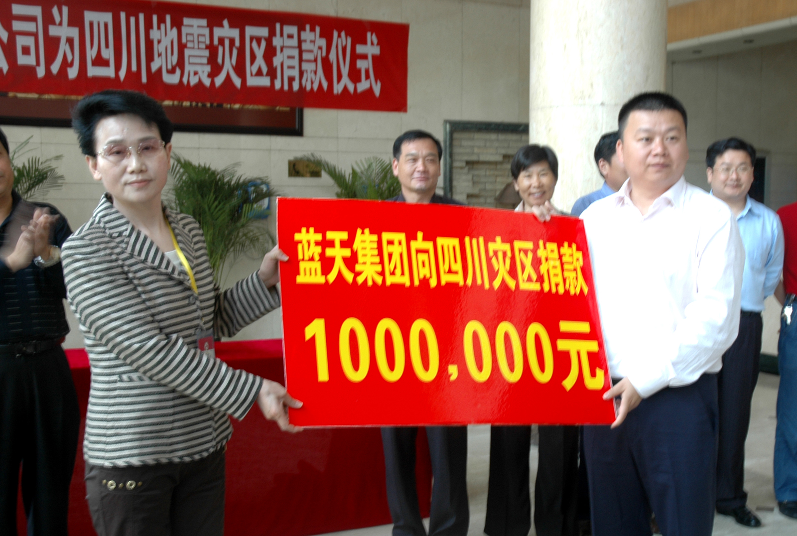 公司党委发动全体员工向四川汶川地震灾区人民捐款献爱心,蓝天集团一次性捐款100万元,干部员工捐款7.8万元。图为捐款仪式现场。